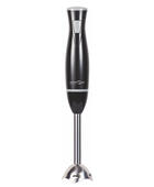 Стильный дизайн идеально впишется в современный интерьер. В комплект входят: моторный блок с корпусом из черного пластика с серебристыми вставками, погружная часть с двойными ножами из нержавеющей стали.