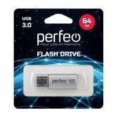USB накопитель Perfeo C14 с колпачком, модель объёмом памяти 64GB, интерфейсом USB 3.0, серебряного цвета имеет компактный размер.