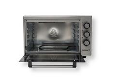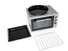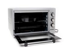 Мини-печь выполнена в термоизолированном корпусе с откидной стеклянной дверцей и подсветкой камеры. Рядом с дверцей расположены 3 поворотных переключателя для управления режимом нагрева, временем и температурой. В комплект входят прямоугольный противень для выпечки, круглый противень и решетка.