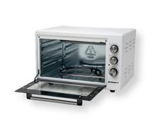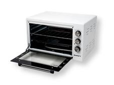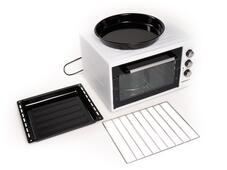 Мини-печь выполнена в термоизолированном корпусе с откидной стеклянной дверцей и подсветкой камеры. Рядом с дверцей расположены 3 поворотных переключателя для управления режимом нагрева, временем и температурой. В комплект входят прямоугольный противень для выпечки, круглый противень и решетка.