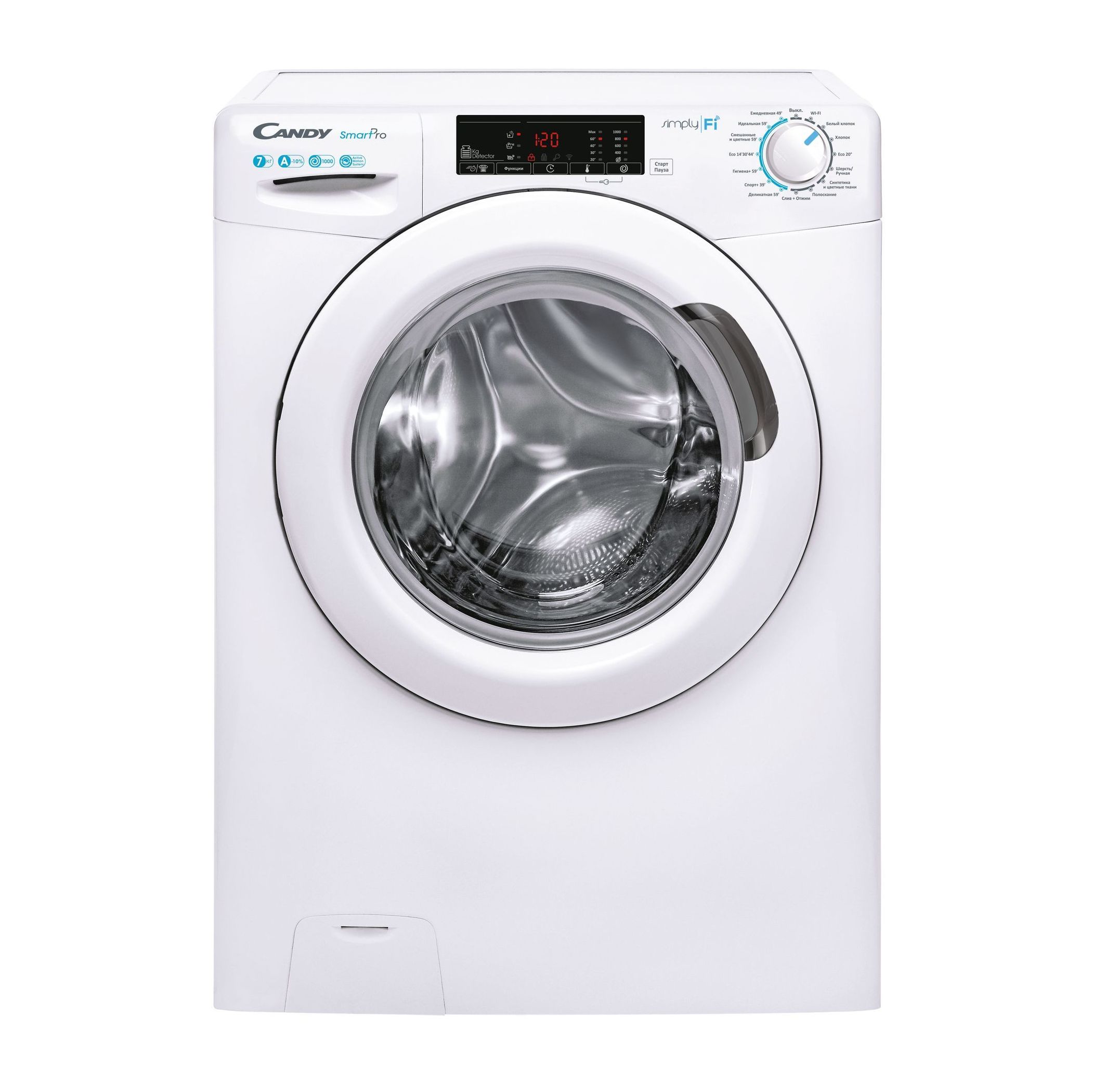 Candy Smart Pro оснащена новой технологией Simply-Fi, открывающей дополнительные и уникальные возможности для взаимодействия со стиральной машиной, такие как: голосовой помощник, удаленное управление по Wi-Fi, до 40 дополнительных программ, создание "любимых" программ, получение статистики стирок и быстрый доступ к часто используемым программам, контроль за состоянием, самодиагностика неисправностей и советы по улучшению эффективности стирок.