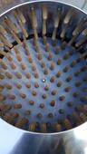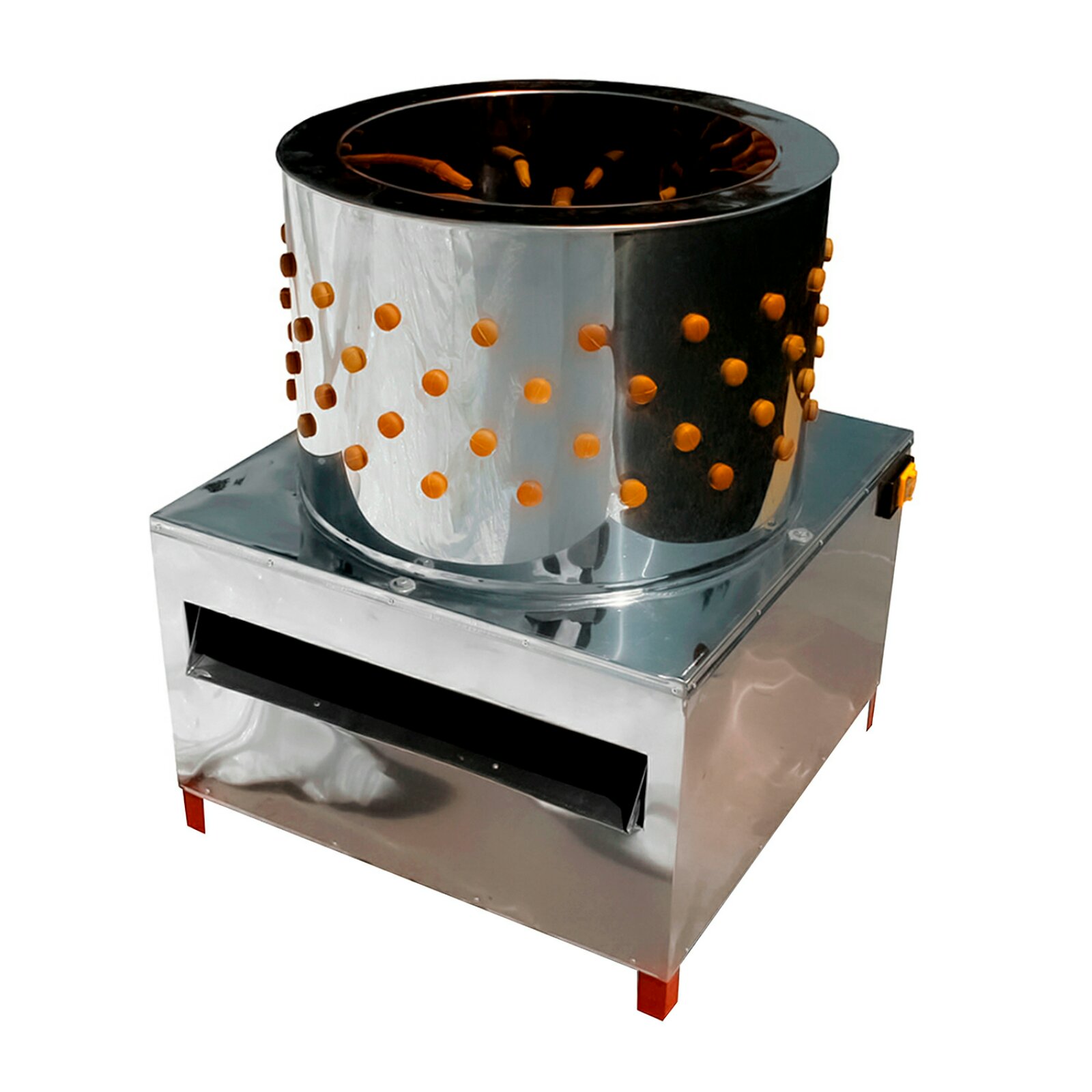 Бытовая электрическая перосъемная машина барабанного типа, предназначена для автоматизации процесса снятия оперения бройлеров, кур несушек, петухов, индеек и других видов птиц. Машина работает по принципу центрифуги. Вращается нижний диск при неподвижном барабане. Корпус машины и барабан из пищевой нержавеющей стали. Бильные пальцы из силикона.
