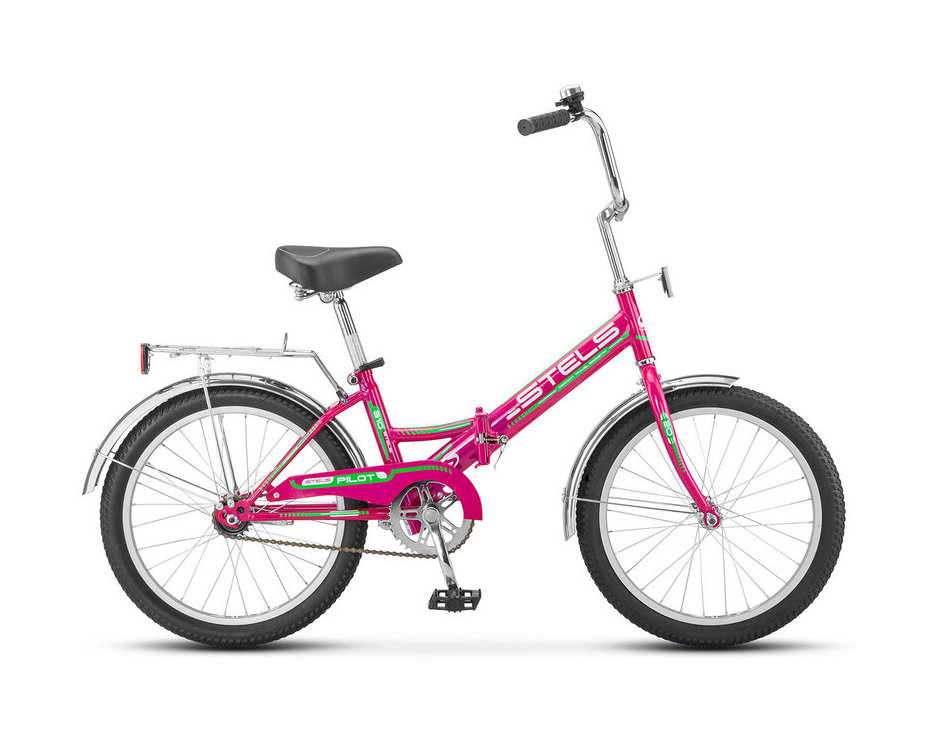 Складной прогулочный велосипед STELS Pilot-310 20" без переключения передач. Технические особенности: складная стальная рама, жесткая стальная вилка, одинарные алюминиевые обода, ножные педальные тормоза, защита цепи, длинные крылья, багажник, звонок.