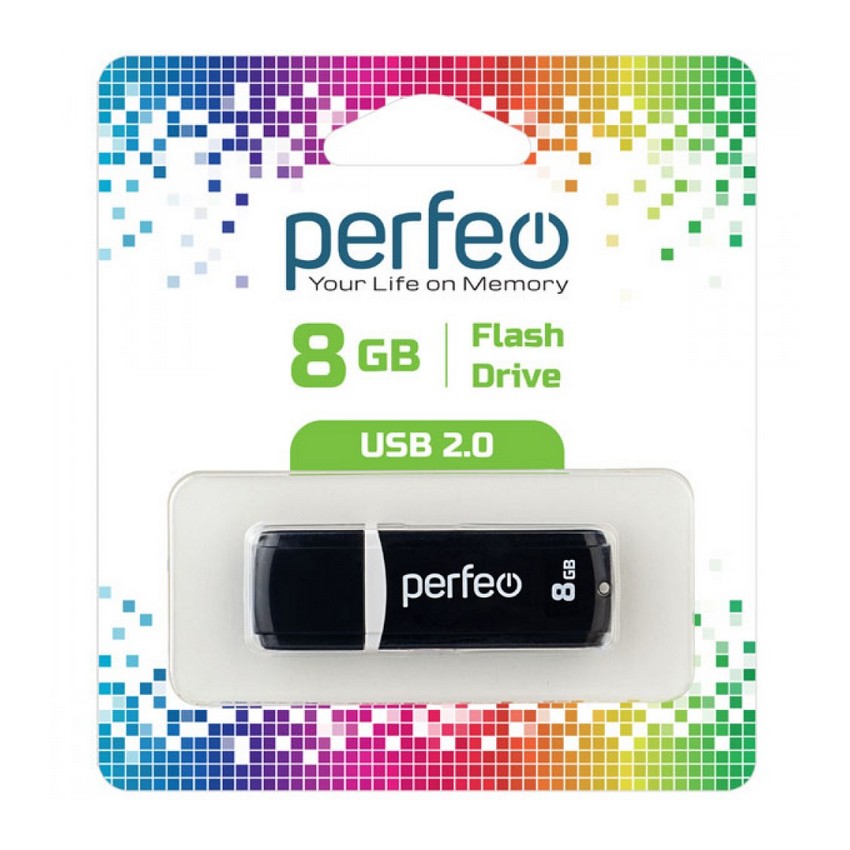 USB накопитель Perfeo C02 с колпачком, модель объёмом памяти 8GB, чёрного цвета имеет компактный размер.
