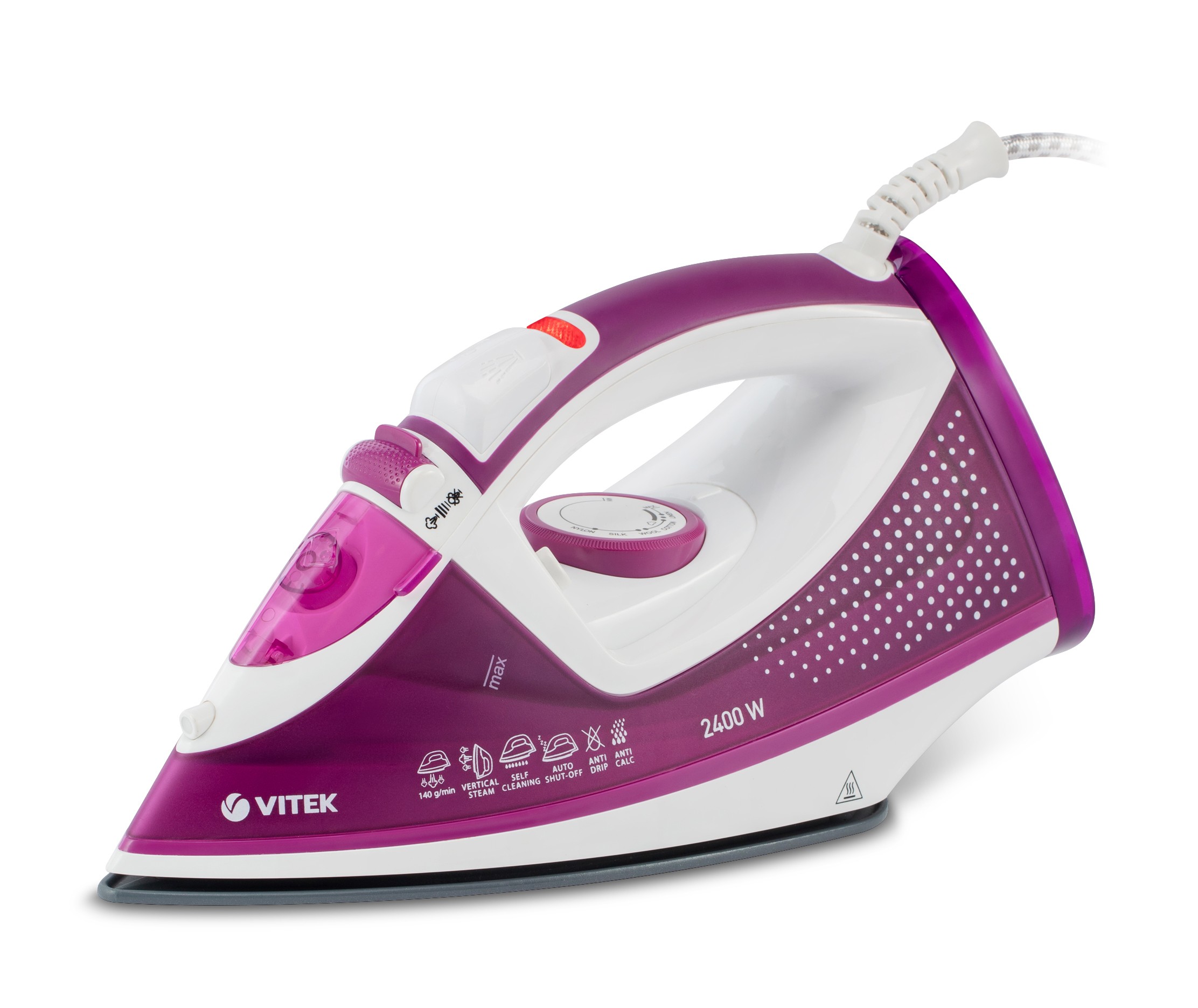 Придать идеальный внешний вид одежде из любых, даже самых плотных тканей, поможет утюг VITEK VT-8346 с максимальной мощностью 2400 Вт. Чтобы минимизировать воздействие на них, в приборе предусмотрена функция вертикального отпаривания (максимальный паровой удар - 140 г/мин). Объем резервуара для воды составляет 300 мл.