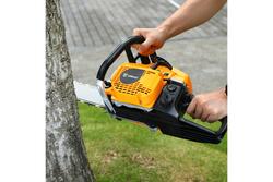 Защитный щиток является одновременно защитой для рук оператора и тормозом цепи, что не позволяет нанести травмы при соскальзывании и обрыве оснастки. Эргономичная задняя рукоять обеспечивает крепкий хват и надежное удержание инструмента.