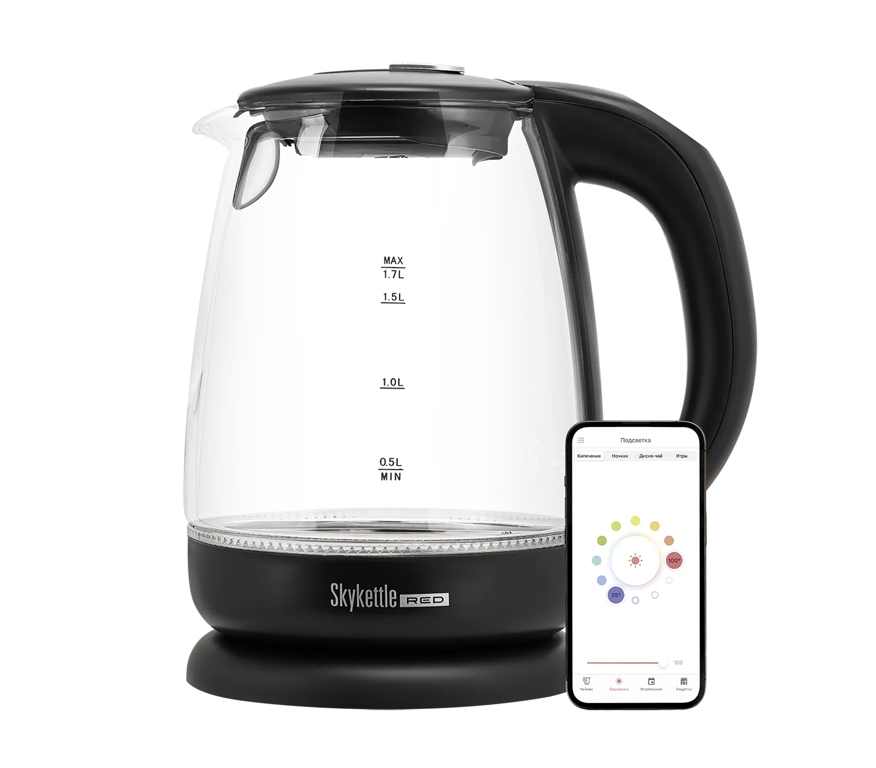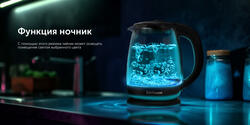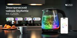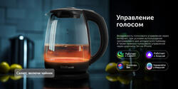 Чайником можно управлять при помощи голосовых команд или через мобильное приложение "SKY. Умный дом и сервисы". Благодаря подсветке чайник работает как кухонный ночник - вы можете выбрать цвет из 16 млн. оттенков. Также в приложении "SKY. Умный дом и сервисы" есть три детских развивающих игры, реализованных при помощи подсветки.