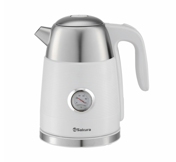 Чайник электрический Premium SAKURA SA-2178W имеет объем 1,7 л при мощности 2200 Вт. Прибор имеет закрытый дисковый нагревательный элемент, выполнен из нержавеющей стали SUS304 с наличием пластиковой накладки на корпусе чайника для защиты от ожогов. Отличительная особенность чайника - встроенный термометр для контроля температуры воды. Эргономичная ручка, встроенный фильтр от накипи, шкала с подсветкой для определения уровня воды, автоотключение при закипании и защита от включения без воды сделают эксплуатацию прибора комфортной и безопасной. Длина шнура 0,7м.