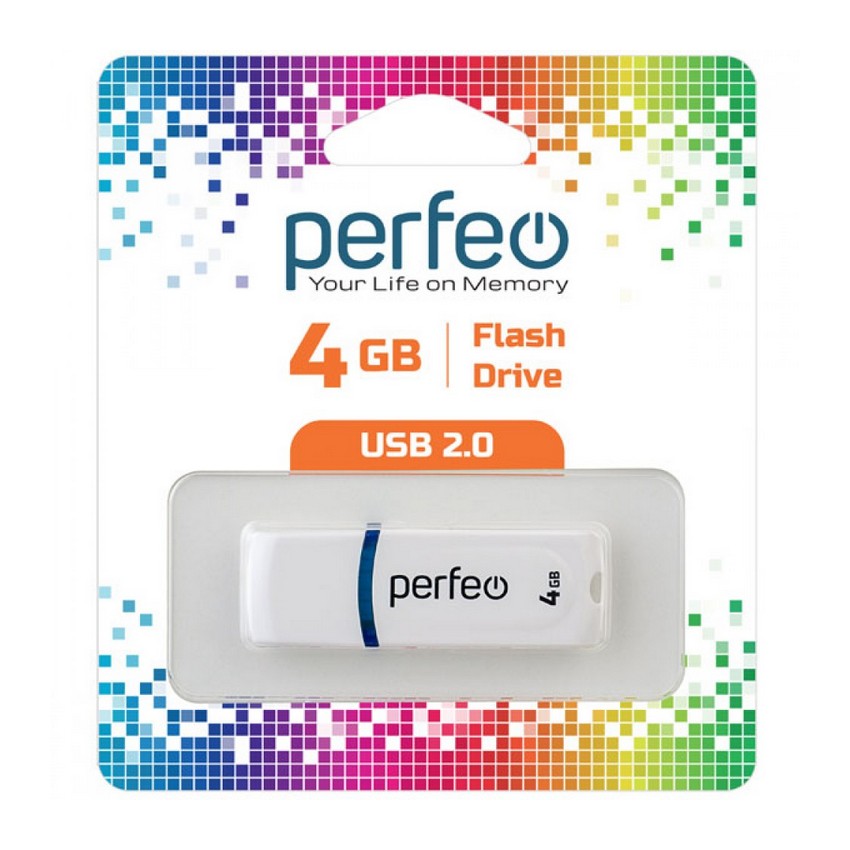 USB накопитель Perfeo с колпачком, модель C09 объемом памяти 4GB, белого цвета имеет компактный размер.