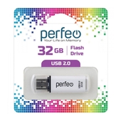 USB накопитель Perfeo C13 с колпачком, модель объёмом памяти 32GB, белого цвета имеет компактный размер.