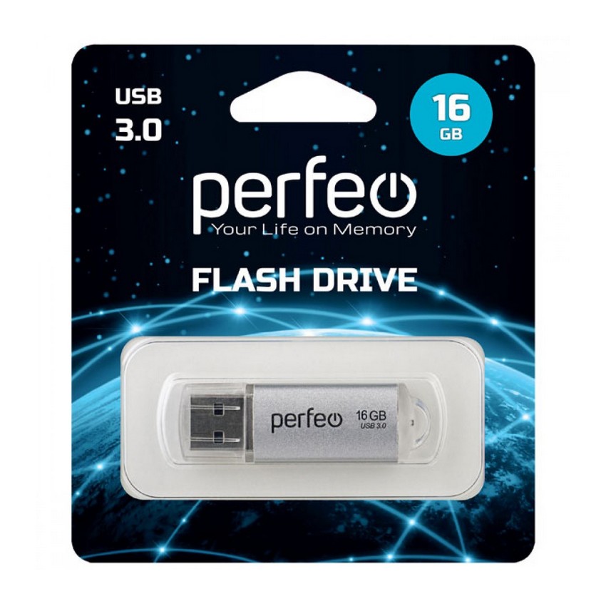 USB накопитель Perfeo C14 с колпачком, модель объёмом памяти 16GB, интерфейсом USB 3.0, серебристого цвета имеет компактный размер.
