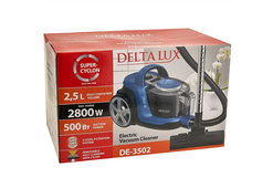 DELTA LUX DE-3502 – это пылесос для сухой домашней уборки циклонного типа с максимальной мощностью 2800Вт, гарантирует повышенные показатели всасывания без потерь мощности в рабочем режиме. Пылесос предназначен для сухой уборки помещений, чистки одежды, ковров и мягкой мебели. Система фильтрации "Супер-циклон" обеспечивает эффективную уборку без использования мешка для сбора пыли.
