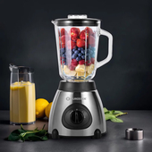 Стационарный блендер Eurostek EBS-7007 отличается от большинства похожих моделей тем, что может похвастаться не только привычным кувшином, но и наличием стеклянной чаши. Ее объем 1500 мл и в ней можно смело измельчать самые разнообразные продукты. Для этого воспользуйтесь режимом пульсации или выберите необходимую скорость при помощи поворотного механизма.