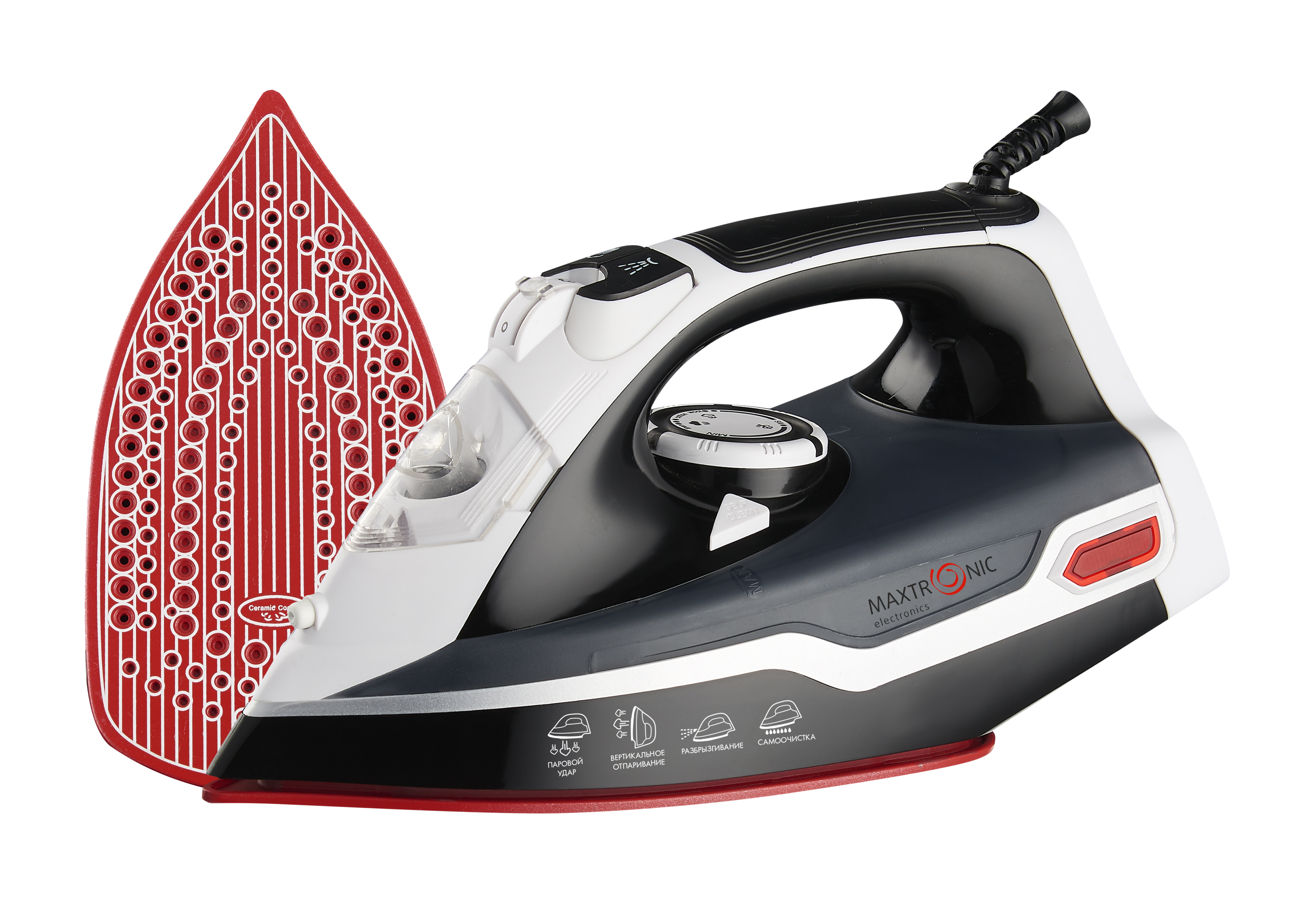 Утюг Maxtronic MAX-277 обеспечивает простое и эффективное глажение: большое количество пара разглаживает жесткие складки, подошва превосходно скользит на любых тканях, а функция очистки от накипи Self-cleaning повышает надежность прибора.