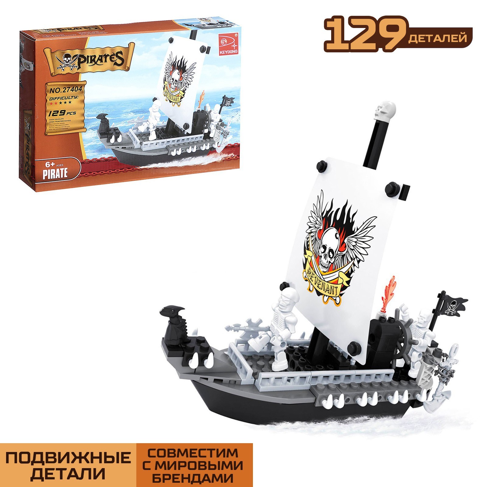 *Конструктор 129 дет. блочный "Пиратский корабль" подвиж.детали, совместим с брендами 134030