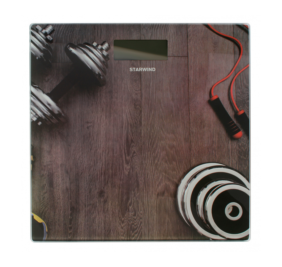 Необыкновенный дизайн электронных напольных весов Starwind SSP6040 обязательно придётся по душе мужчине или любителю спорта и идеально впишется в комнату спортзала. Рисунок в виде двух гантель, трех дисков разного веса и спортивной скакалки, находящихся на деревянном паркете коричневого цвета нанесен на закаленное стекло платформы таким способом, что он не слазит и не сдирается.