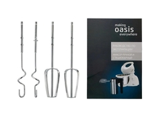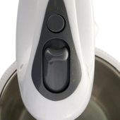Модель имеет два комплекта насадок (венчики и крюки), которые позволяют вам выбрать оптимальный вариант для различных ингредиентов и рецептов. Кнопка быстрого отсоединения насадок и блокировка кнопки включения делают процесс смены насадок и управления миксером максимально удобным и безопасным.