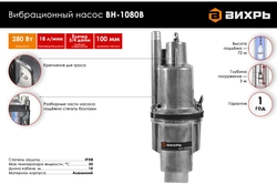 Электронасос вибрационный погружной Вихрь ВН-1080В, предназначен для подачи воды в бытовых условиях из скважин, могут использоваться также для подачи воды из шахтных колодцев, резервуаров и открытых водоемов для полива садов и огородов. Насосы способны перекачивать воду на большие расстояния горизонтально, т.е. подавать воду из водоемов, расположенных на значительном расстоянии от мест использования воды.
