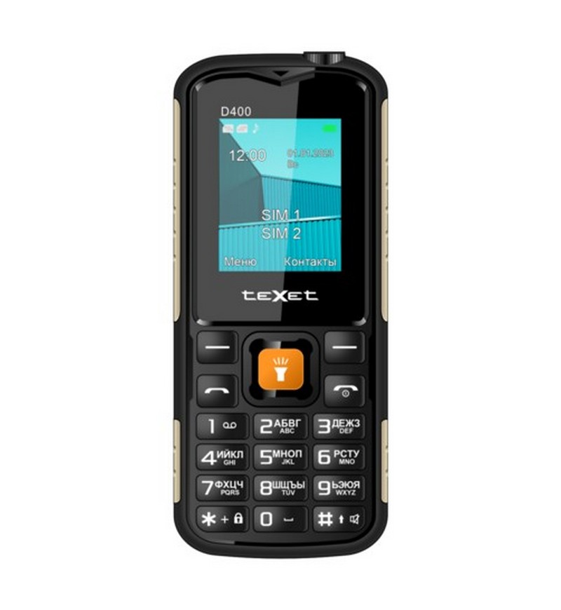 Мобильный телефон кнопочный teXet TM-D400 имеет компактные размеры, а корпус обладает классом защиты IP54 и укреплён алюминиевыми рёбрами по бокам. Устройство оснащено ЖК-экраном 1,77 дюйма и аккумулятором на 1500 мА*ч, что позволяет быть на связи до 6-7 часов. TM-D400 выпускается в двух цветовых решениях - черный и зелёный.