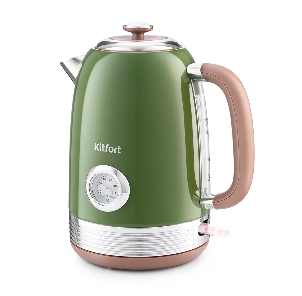 Чайник Kitfort КТ-6110 имеет встроенный термометр, выполненный в винтажном стиле. Это очень удобно для заваривания различных напитков, для которых требуется определённая температура воды. Например, зелёный чай, белый чай, кофе и тд. Форма корпуса, стильный дизайн и оригинальное цветовое решение сделают чайник украшением вашей кухни! Корпус и крышка прибора выполнены из нержавеющей стали. Ручка пластиковая, не нагревается и удобно лежит в руке.