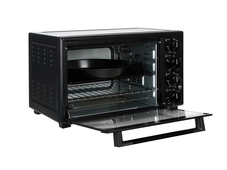 Поворотные переключатели способствуют быстрому выбору и легкой установке параметров готовки. Благодаря дверце из закаленного стекла вы с легкостью сможете контролировать приготовление блюда. Таймер со звуковым сигналом уведомляет о завершении процесса. В комплект входят: прямоугольный противень, круглый противень, прихваты и решетка.