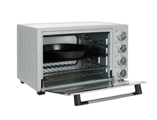 Поворотные переключатели способствуют быстрому выбору и легкой установке параметров готовки. Благодаря дверце из закаленного стекла вы с легкостью сможете контролировать приготовление блюда. Таймер со звуковым сигналом уведомляет о завершении процесса. В комплект входят: прямоугольный противень, круглый противень, прихваты и решетка.