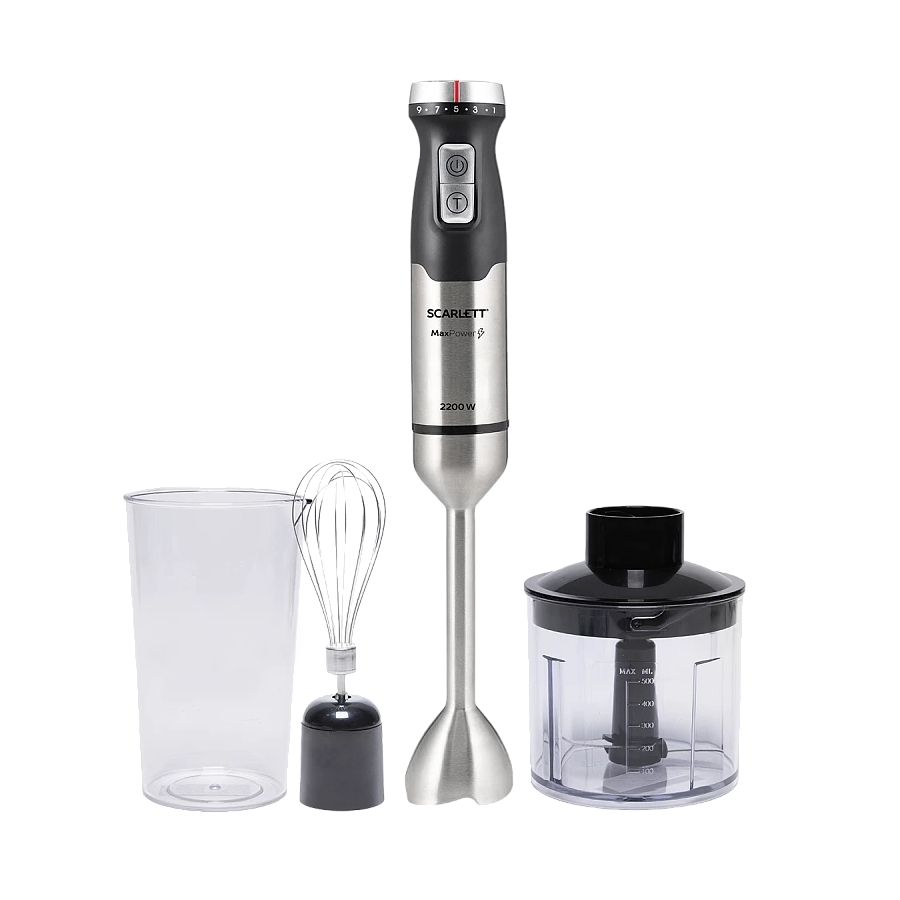 Scarlett SC-HB42F40 – погружной блендер 3 в 1, подходит для измельчения, взбивания и смешивания. Венчик поможет взбить легкое тесто и яичные белки, измельчитель 500 мл с легкостью справится с приготовлением овощной зажарки и рубленого фарша.
