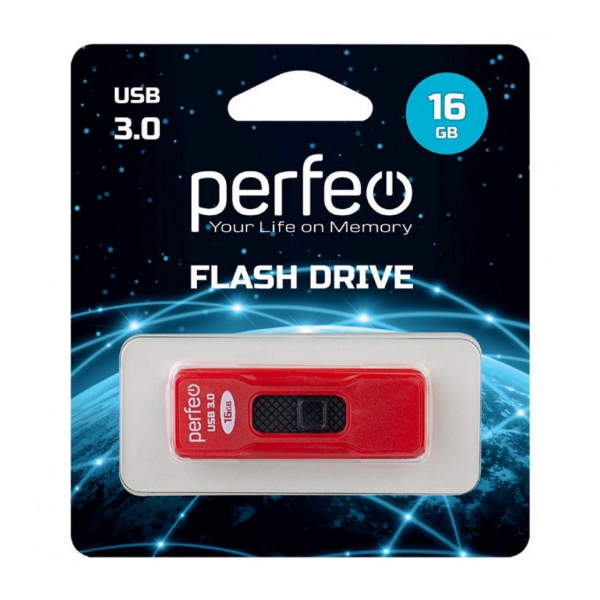Высокоскоростной USB накопитель Perfeo USB 3.0 модель S05 с выдвижным коннектором, объёмом памяти 16GB, красного цвета имеет компактный размер.