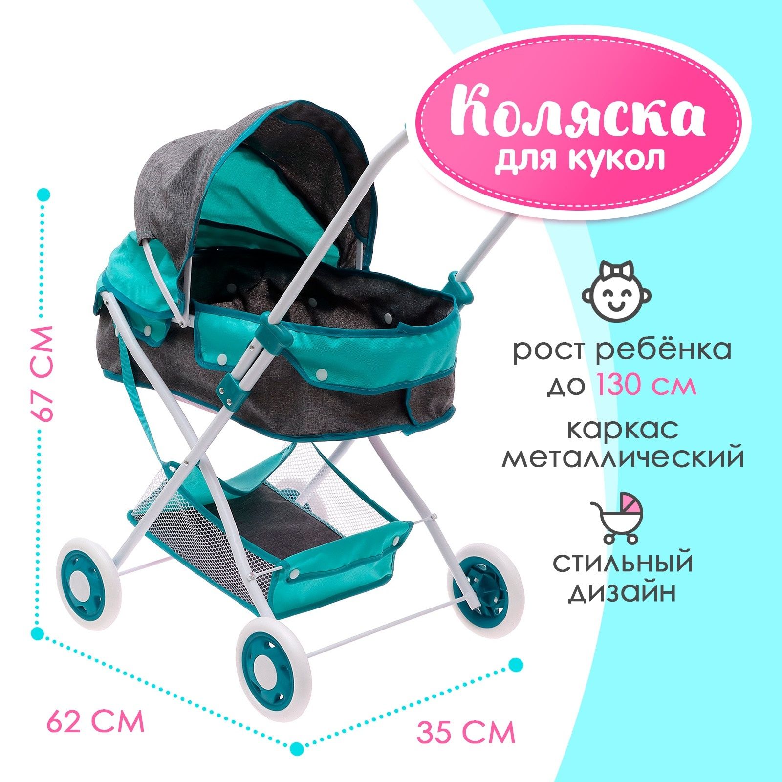 *Коляска кукольная люлька универс-ая, металл. каркас, корзинка "Прогулка" 10156509