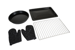 В комплект входят: прямоугольный противень, круглый противень, прихваты и решетка.