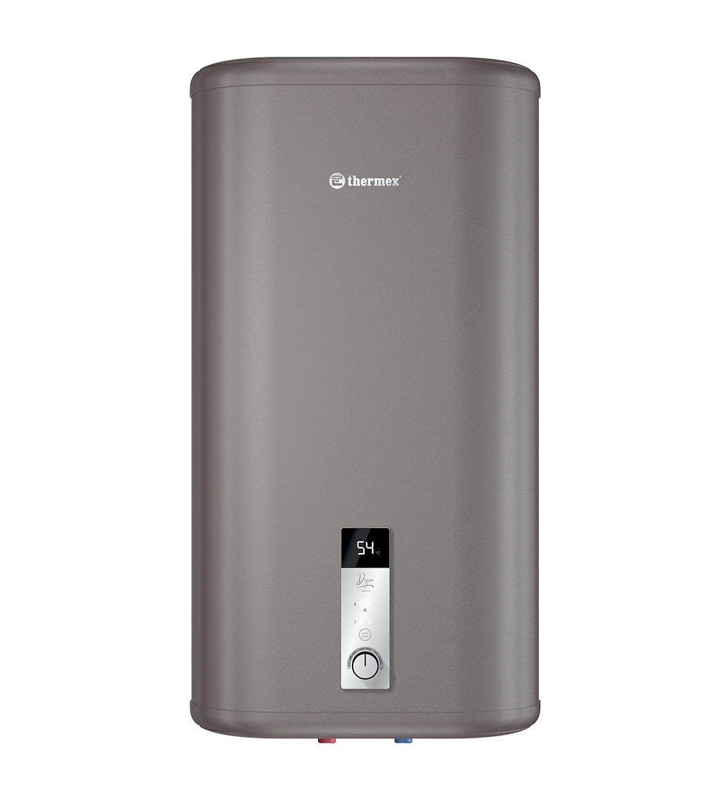 Электроводонагреватель THERMEX Dogma 50 V представляет собой ёмкость объемом 50 литров. Нагрев воды внутри бака производится при помощи одного ТЭНа. На передней поверхности водонагревателя расположена панель управления.