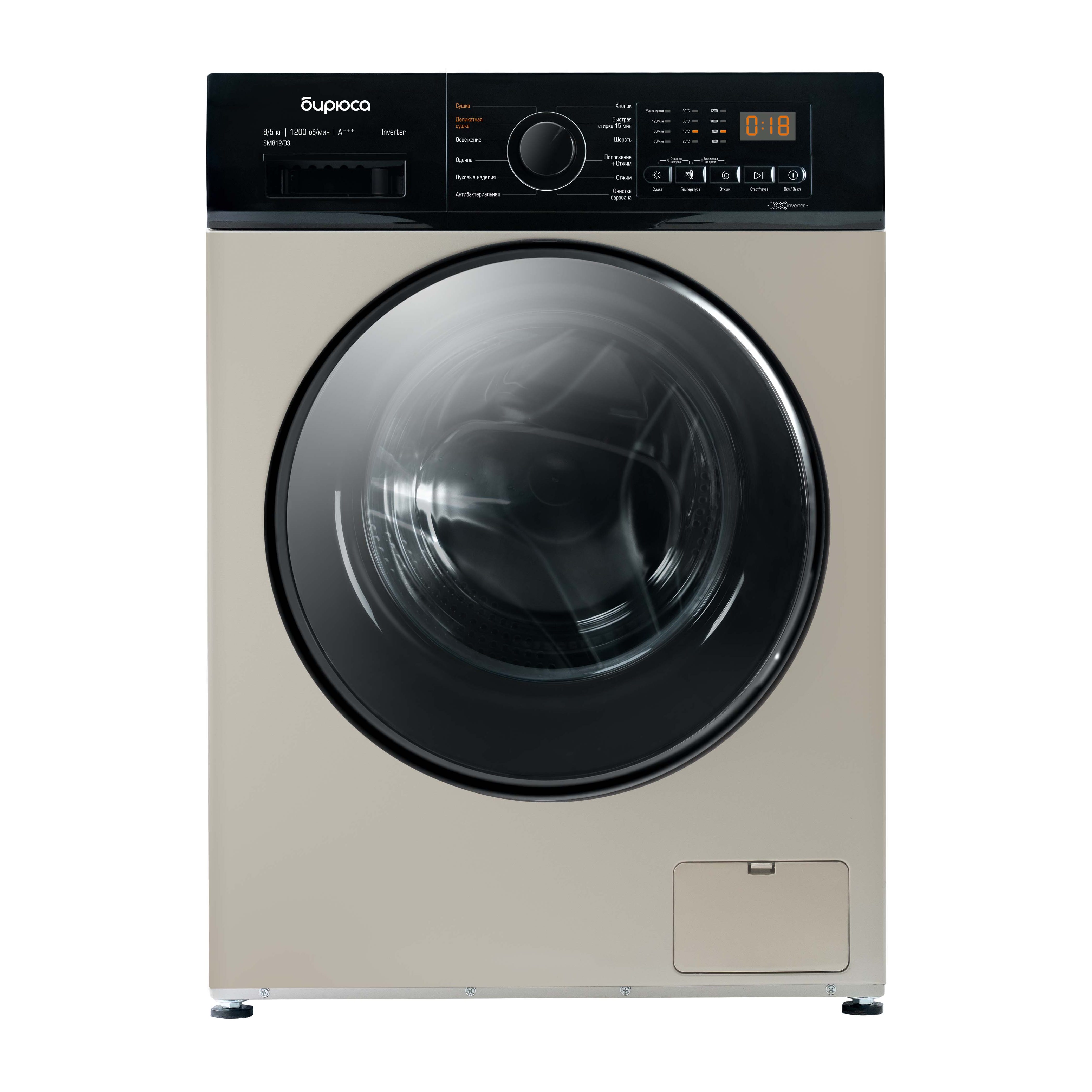 Стирально-сушильная машина Бирюса WMD-SM812/03B обладает фронтальной загрузкой и способна вместить до 8 кг белья за один цикл работы, класс эффективности стирки данной модели A+++. Максимальная скорость вращения барабана при отжиме составляет 1200 оборотов в минуту.