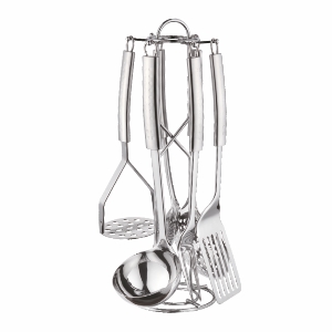 Набор кухонных принадлежностей 7 шт: стойка для хранения, половник, вилка, шумовка, лопатка с прорезями, ложка, пресс для картофеля. Материал: нержавеющая сталь.