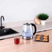 Наблюдение за процессом кипячения воды доставит вам эстетическое удовольствие, благодаря эффектной подсветки корпуса. Пользоваться чайником очень удобно: он способен поворачиваться на 360°, а его крышка открывается простым нажатием на кнопку. Следить за уровнем воды поможет специальная шкала, расположенная на боковой поверхности прибора. Внутренняя подсветка также позволяет удобно пользоваться прибором даже при слабом освещении.