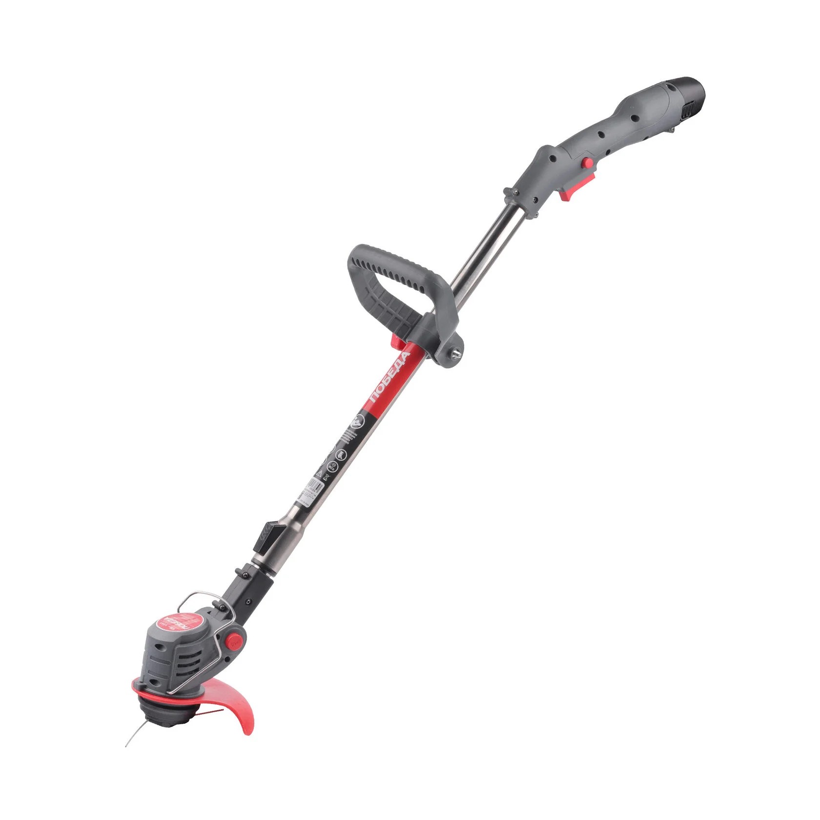 Лёгкий бытовой аккумуляторный триммер Победа ТА-120 с регулируемой D-образной передней рукояткой, телескопической штангой, изменяемым углом наклона головки. Укомплектован съёмным аккумулятором, пластиковыми ножами для кошения травы и металлическим диском с твёрдосплавными зубьями для срезания подроста при формировании кроны небольших декоративных деревьев и кустарников.