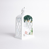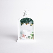 Внутри новогоднего фонарика имитация свечи. На прозрачных стенках зимний сюжет со снеговиком. Цвет свечения теплый белый. Материал корпуса - белый пластик. Фонарик работает от батареек AG10*3 шт (в комплекте). Размер: 145*78*53 см.
