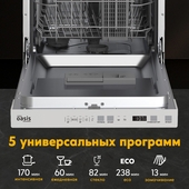 Дозагрузка посуды позволяет добавить забытый предмет в середине цикла, не останавливая её. Половинная загрузка позволяет не тратить много электроэнергии, воды и моющего средства при мытье небольшого количества посуды. Яркий LED-дисплей отображает выбранные программы, оставшееся время и другую важную информацию. Система защиты AquaStop гарантирует защиту от протечек и затопления.