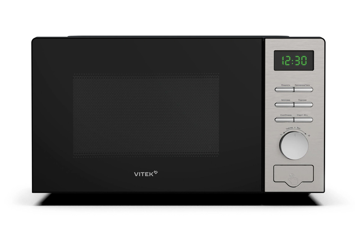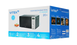 Корпус выполнен в черном цвете с аккуратными серебристыми акцентами из нержавеющей стали и хрома. Габариты составляют 45.6x32.6x26.3 см, масса 10.5 кг. Такая компоновка облегчает установку на столешнице или в нише, а гладкие внутренние поверхности рассчитаны на легкую очистку после приготовления. VT-MW0620 сочетает понятное управление и продуманные режимы, благодаря чему одинаково уверенно разогревает обед, бережно размораживает полуфабрикаты и помогает быстро приготовить простые блюда.
