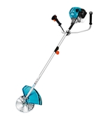 Мотокоса оснащена двухтактным бензиновым двигателем мощностью 3,3 л.с. и объемом 52 см³. Все детали изготовлены из качественных материалов. Ударопрочный кожух защищает от камней. В комплекте есть инструменты, дисковый нож и бутылка для смешивания топлива и масла.